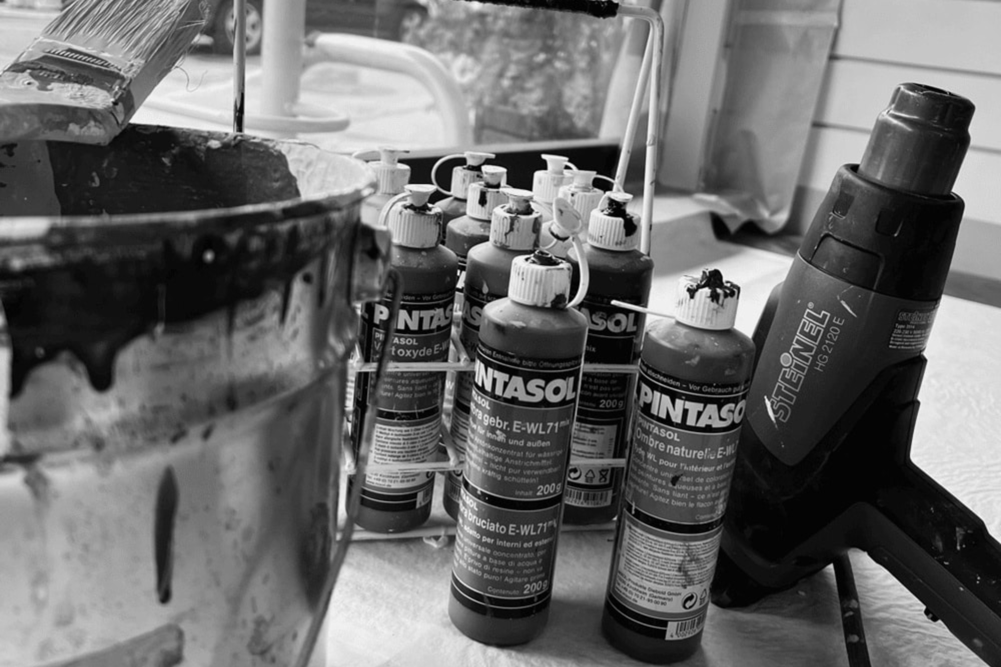 Der Vater der Gebrüder Bischoff begann seine Malertätigkeiten indem er mit Velo und Anhänger von Kunde zu Kunde zog.